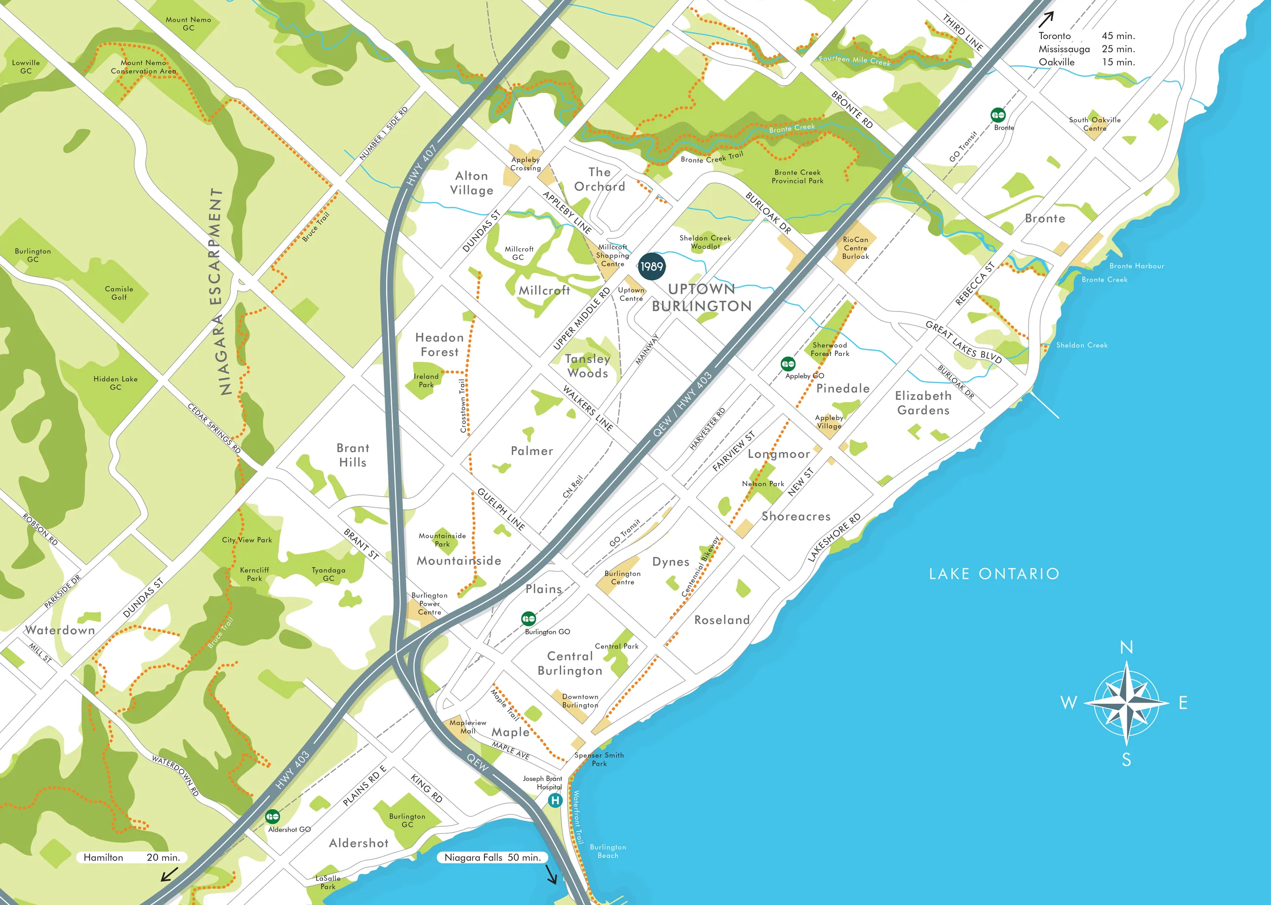 • The strategic location of the 1989 Condos at the junction of Appleby Line and Upper Middle Road provides residents with easy access to major highways such as 403 and 407, enhancing connectivity to neighboring cities like Hamilton, Mississauga, and Toronto.